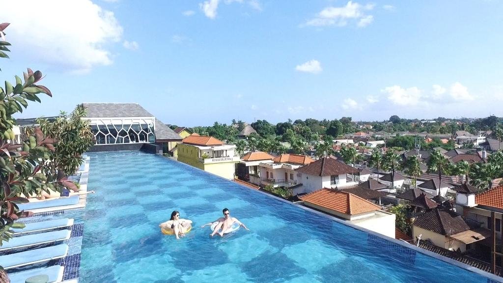 Our 50-meter rooftop pool offering spectacular views of Seminyak throughout the day and beautiful starry skies at night. Strike your favourite pose while relaxing in the pool or enjoying your favourite cocktail at our pool bar.